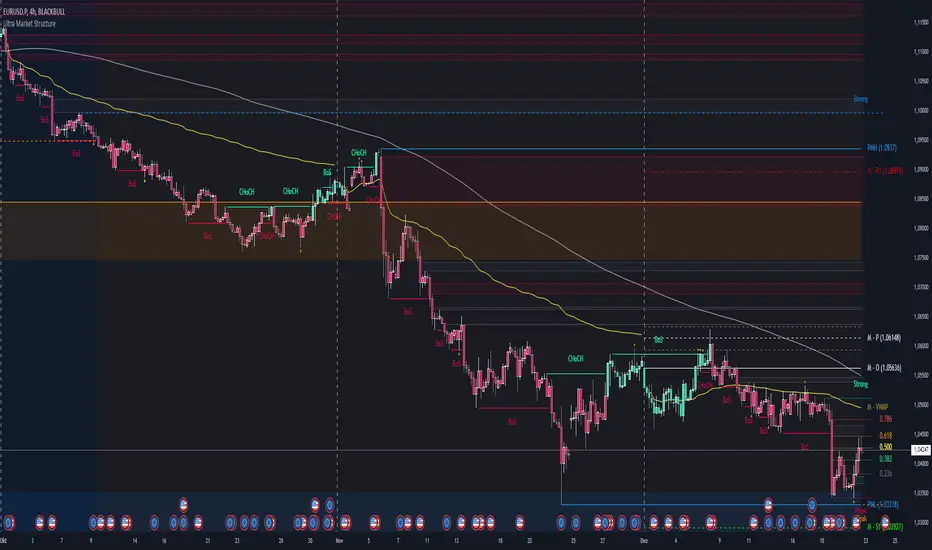 The Ultra Market Structure indicator detects key market structure breaks, such as Break of Structure (BoS) and Change of Character (CHoCH), to help identify trend reversals. It plots lines and labels on the chart to visualize these breakpoints with alerts for important signals.