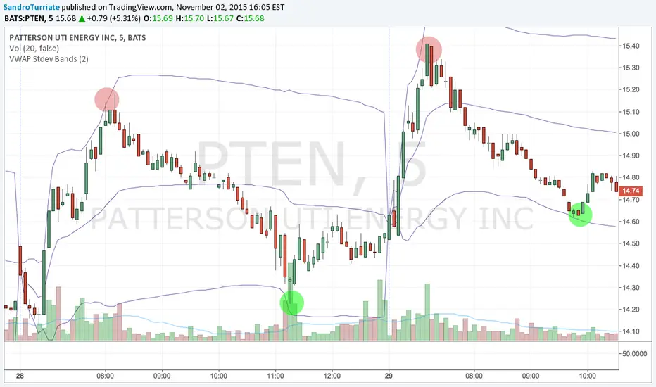This indicator plots VWAP with 2x Standard Deviation bands. This could potentially be used to trade a mean reversion type strategy. Only works on intraday charts.