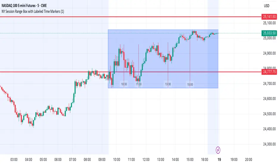 Shows opening time ny session by timing with lines to inform traders to avoid 11:30am to 1:30pm for choppy sessions and mark early and power hour .