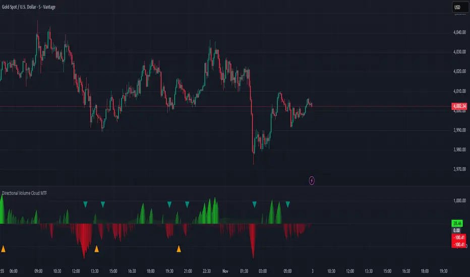 The Directional Volume Cloud MTF transforms raw volume into a visually intuitive cloud histogram that highlights directional bias and exhaustion zones.