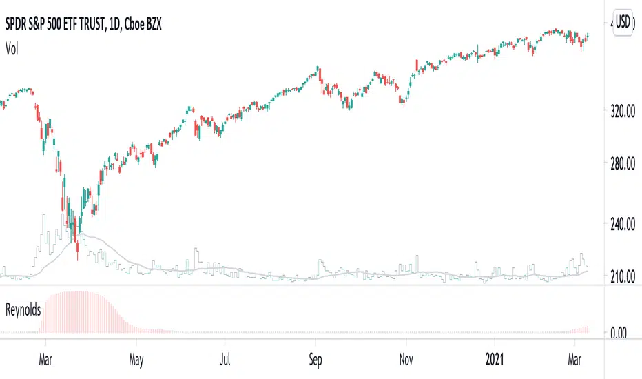 In fluid mechanics, the Reynolds number is the ratio of inertial forces to viscous forces within a fluid. Laminar flow occurs at low Reynolds numbers (i.e., viscous forces are dominant), whereas turbulent flow occurs at high Reynolds numbers (i.e., inertial forces are dominant). In the Turbulence indicator, I define that laminar flow occurs when simple moving averages have no interactions. In contrast, turbulent flow occurs when simple moving averages have chaotic interactions (i.e., irregular crossing and convergence).