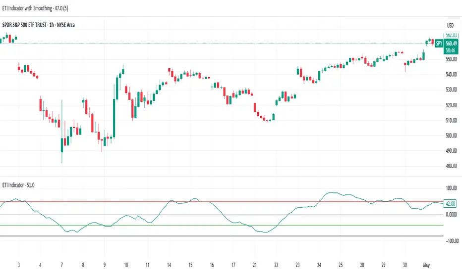 Traditionally, I have treated values above +50 as overbought and below -40 as undersold (with -80 indicating extremely oversold); however these levels could also indicate either upwards and downwards momentum so taking a position based on where the ETI is (rather than crossing levels) should be done with caution.