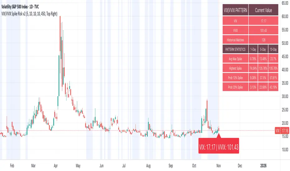 By combining current VIX and VVIX levels as dual filters, it identifies historical precedents and calculates the probability and magnitude of VIX spikes over the next 1, 5, and 10 trading days.