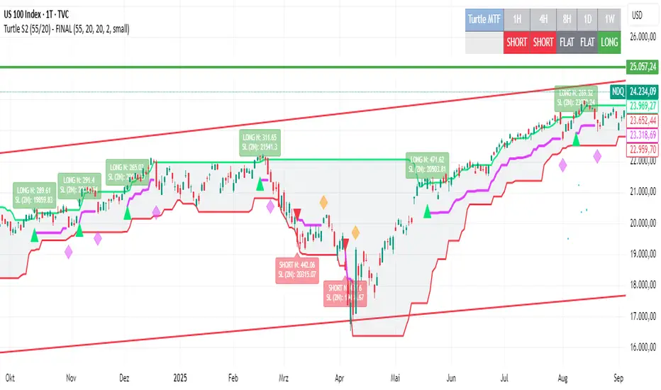 SETS the initial and Trailing Stop at $\mathbf{2N}$.🛠️ Technical Implementation1. Correct Trailing Stop (Section 4)In contrast to many flawed implementations, the Trailing Stop is implemented here according to the Original Turtle Logic. The stop price (current_stop_price) is not aggressively tied to the current low or high. Instead, at the close of each bar, it is only trailed in the direction of the trade (math.max for long positions) based on the formula:$$\text{New Trailing Stop} = \text{max}(\text{Previous Stop}, \text{Close} \pm (2 \times N))$$This ensures the stop is only adjusted upon sustained positive movement and is not prematurely triggered by short-term, deep price shadows.2. Reliable Multi-Timeframe (MTF) Logic (Section 6)The MTF section utilizes global var int variables (mtf_status_1h, mtf_status_D, etc.) in conjunction with the request.security() function.Purpose: Calculates and persistently stores the current Turtle System 2 status (LONG=1, SHORT=-1, FLAT=0) for the timeframes 1H, 4H, 8H, 1D, and 1W.Advantage: By persistently storing the status using the var variables, the critical error of single-update status is eliminated. The states shown in the table are reliable and accurately reflect the Turtle System's position status on the respective timeframes.3. Visual ComponentsDonchian Channels: The entry (55-period) and exit (20-period) channels are drawn with color highlighting.N-Stop Line: The dynamically calculated Trailing Stop ($\mathbf{2N}$) is displayed as a magenta line.Visual Signals: plotshape markers indicate Entry and Exit points.MTF Table: A compact status summary with color coding (Green/Red/Gray) for the higher timeframes is displayed in the upper right corner.