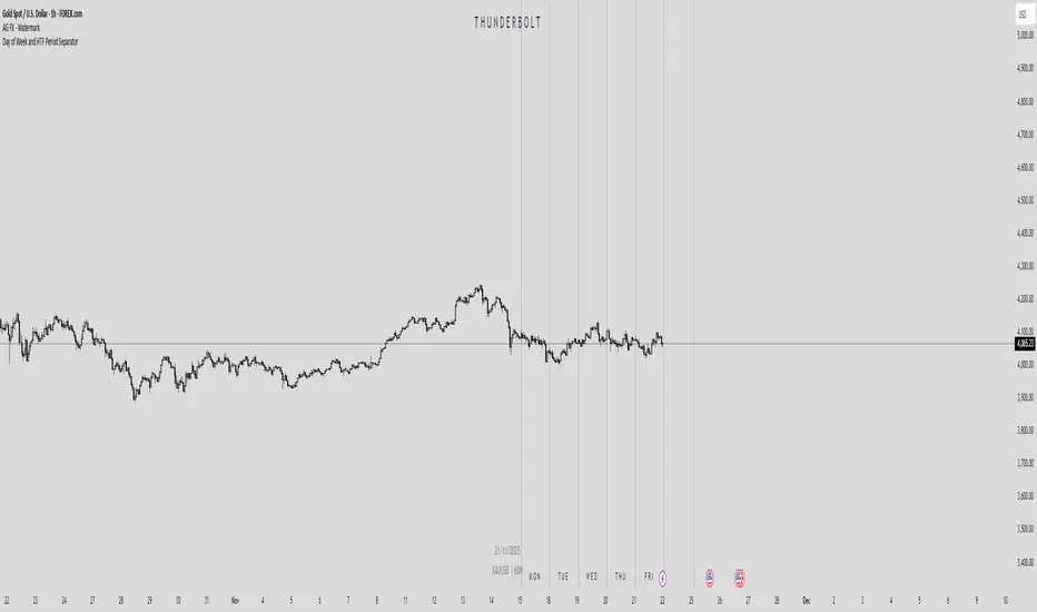 This indicator displays vertical lines to separate each day of the trading week, along with the optional 4hr separators. It also shows day-of-week labels (MON, TUE, etc.) at a specified hour for quick visual reference. Useful for intraday traders who want a clear view of daily and higher timeframe transitions.