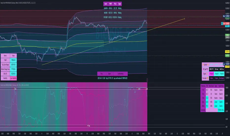 This Pine Script (version 5) script implements a comprehensive trading indicator called "VWAP Vision #WhiteRabbit," designed for analyzing price movements using the Volume-Weighted Average Price (VWAP) along with multiple customizable features, including adjustable color themes for better visual appeal.