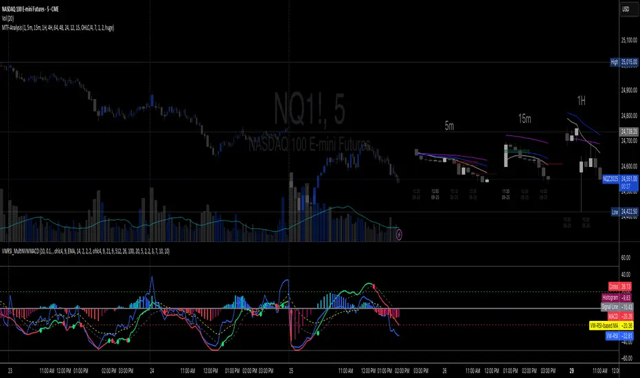 The Multi-Timeframe Analysis indicator is a powerful visualization tool designed for traders who incorporate multi-timeframe (MTF) strategies into their decision-making process. It overlays compact, customizable candle representations from up to four higher timeframes directly on your chart, positioned to the right of the last bar for quick reference. This allows you to monitor price action, momentum via EMAs, and key levels like Fair Value Gaps (FVGs) across multiple resolutions without switching charts. Built with efficiency in mind, it supports automatic timeframe detection, real-time updates, and a clean, non-intrusive design that enhances your trading workflow.