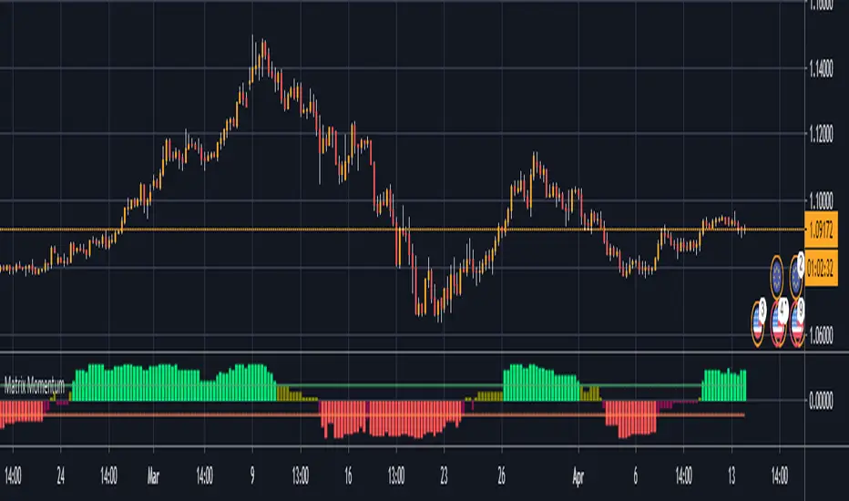 This indicator gives a score to the momentum of a market in a percentage term based on a combination of measurements, this can be used on any time frame, on any instrument to identify if the current trend has enough momentum to see it carry on further this will help eliminate fomo and also help you to identify reversals in the chart at the right time so you can eliminate exposure to a market about to reverse, there is 4 levels to this indicator you have a strong bullish trend denote by green bars the weaker bullish trend denoted by the olive coloured bars, a weak bearish trend which is given in maroon bars and a strong bearish trend which gives red bars you will also note the 2 horizontal boundary lines these are not overbought and oversold bounds like in most indicators but actually indicate whether there is sufficient momentum in the market as the idea is that in strong momentum you want it to be above or below this line to give you confidence there is momentum available to ride