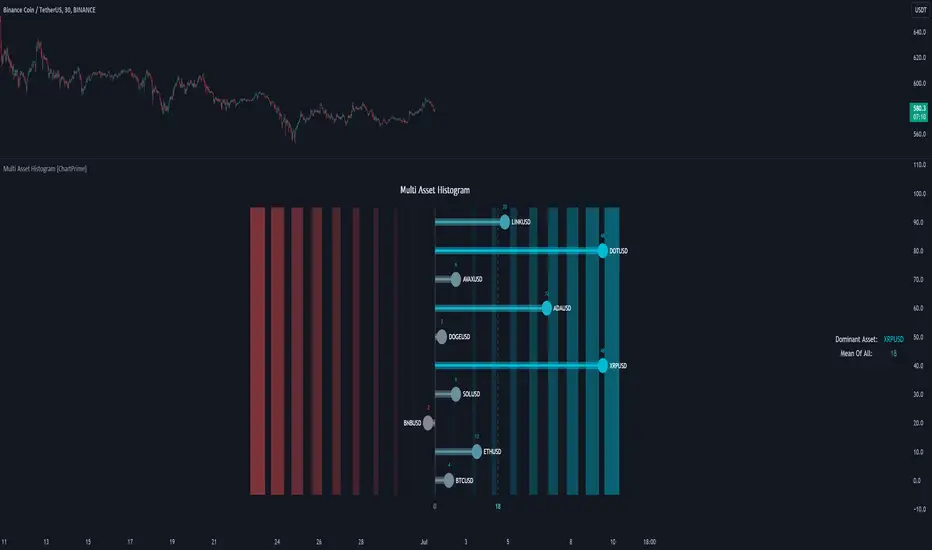 The "Multi Asset Histogram" indicator provides a comprehensive visualization of the performance of multiple assets relative to each other. By calculating a score for each asset and displaying it in a histogram format, this indicator helps traders quickly identify the trends, dominant asset and the average performance of the assets in the selected group.