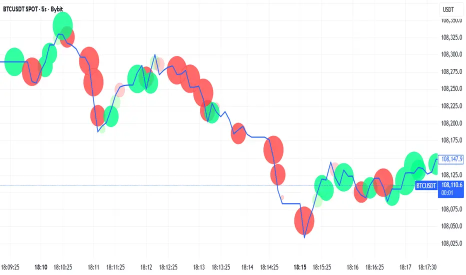 - Bubbles scale based on delta strength relative to a customizable moving average (default 20 bars)
