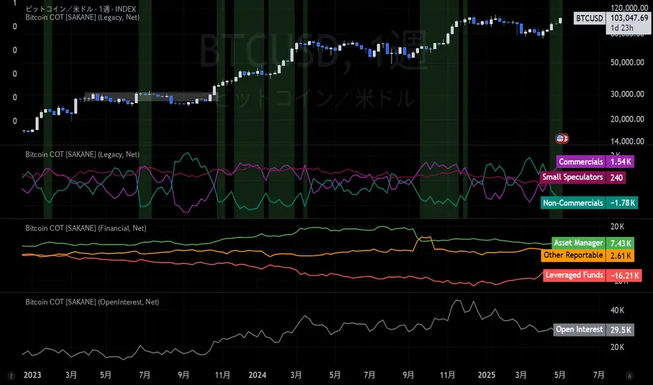 Bitcoin COT [SAKANE] is an indicator that visualizes Bitcoin futures market positions based on the Commitment of Traders (COT) report provided by the CFTC (Commodity Futures Trading Commission).