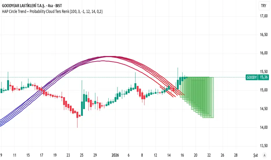 The HAP Circle Trend – Probability Cloud indicator combines a circle-based trend analysis with a Gaussian probability cloud to visualize potential future price movement.