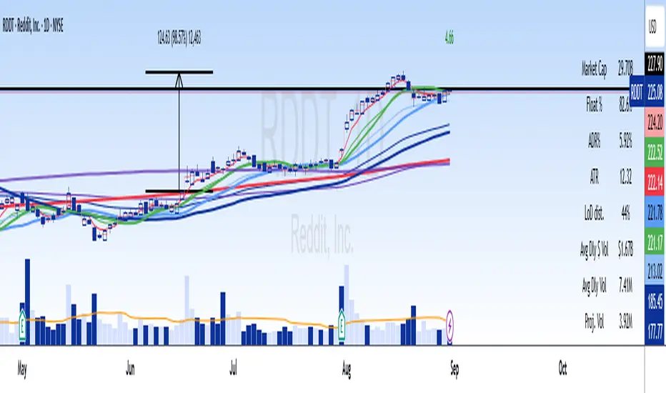 Indicator produces a multiple of ADR% from the 50-day simple moving average to determine is a stock or etf is extended.