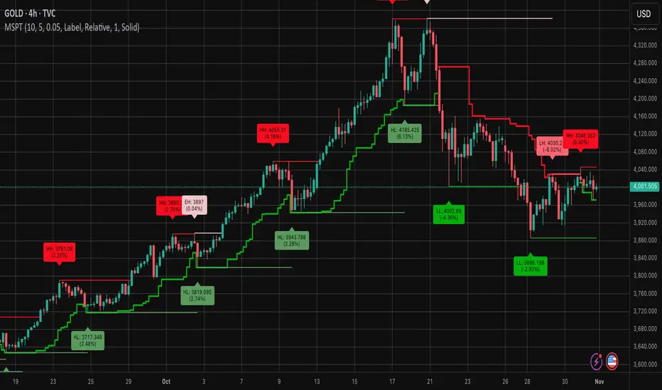 Price Tolerance Filter: A user-defined percentage tolerance filters out insignificant market noise. A pivot is only classified as 'Higher' or 'Lower' if its price exceeds the previous one by more than the set tolerance, leading to more robust signals.
