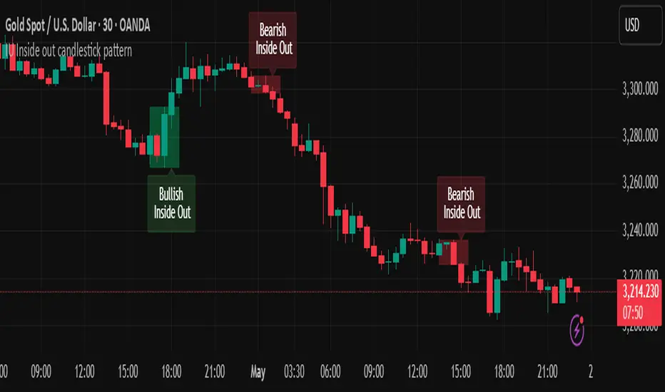 This indicator identifies the Inside Out Candlestick Pattern — a unique 3-bar price action setup that captures strong market momentum and potential reversals with greater reliability than traditional patterns.