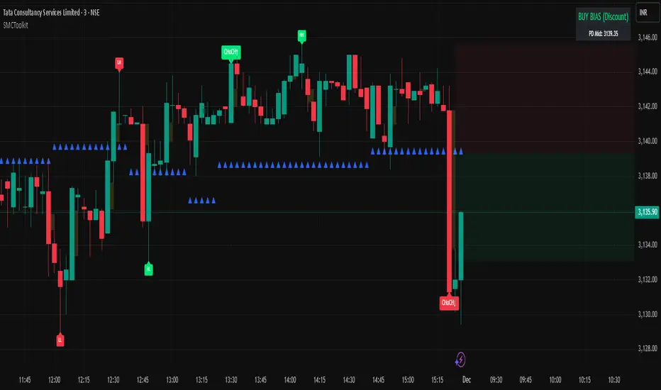 It is built around the PD Engine, which calculates the midpoint of the most recent market swing and dynamically determines BUY or SELL bias based on where current price trades relative to that equilibrium. This toolkit visualizes structure, order blocks, and bias context in one clean map, giving traders an institutional-grade view without unnecessary signal clutter.