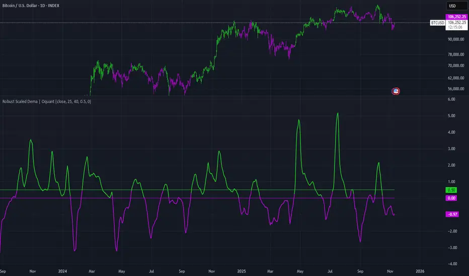 The indicator starts by applying a DEMA to the chosen price source to create a smoothed representation of the market's direction. This smoothed value is then scaled using a robust statistical approach that accounts for the distribution of recent DEMA values, centering it around a median and adjusting for variability to minimize the influence of outliers. The resulting scaled metric is compared against user-set upper and lower thresholds: crossing above the upper suggests a bullish momentum (long signal), while dipping below the lower indicates bearish conditions (short signal). A state variable tracks these conditions to color the chart accordingly, helping traders visualize regime changes. Optional alerts fire on transitions.