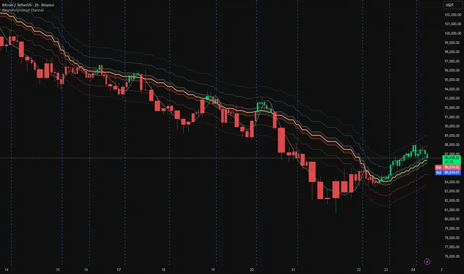 While full deep-learning models cannot be directly implemented in Pine Script due to computational and architectural limitations, the NeuroPolynomial Channel brings core AI concepts into TradingView through mathematically constrained approximations, creating an efficient, real-time neural structure model suitable for intraday and swing analysis.