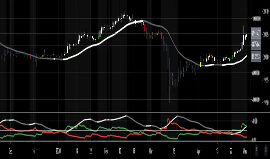ADX trend with bar color and background color for strength of trend. Use yellow bar for alert of possible uptrend, use orange bar for alert of possible downtrend. Green bar indicates a strong move upward, red indicates a strong move downward. Background will lighten (can change to any shade) for duration of trend. Exit trend, or TP, when background returns to normal. ADX below threshold is chop. Add this indicator to the main chart as well, and delete all of the indicators, except for background.