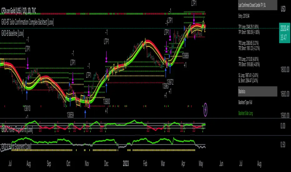 The Solo Confirmation Complex Backtest module enables users to perform backtesting on Standard Long and Short signals from GKD-C confirmation indicators, filtered by GKD-B Baseline and GKD-V Volatility/Volume indicators. This module represents a complex form of the Solo Confirmation Backtest in the GKD trading system. It includes two types of backtests: Trading and Full. The Trading backtest allows users to test individual trades, both Long and Short, one at a time. On the other hand, the Full backtest allows users to test either Longs or Shorts by toggling between them in the settings to view the results for each signal type. The Trading backtest simulates real trading, while the Full backtest tests all signals, whether Long or Short.
