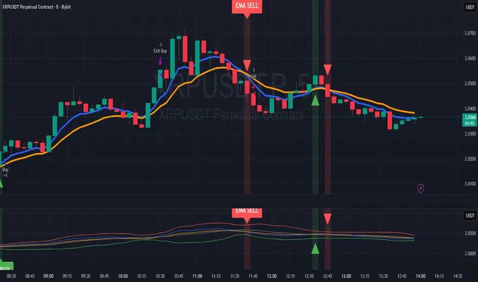Red “SELL” or “EMA SELL” labels and triangle-down arrows above candles for bearish signals (EMA crossovers, bearish engulfing, shooting star, doji, evening star, three black crows, double top).