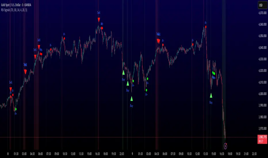 This indicator generates trading signals based on Relative Strength Index (RSI) movements with multiple confirmation layers designed to filter false signals and identify high-probability reversal opportunities.