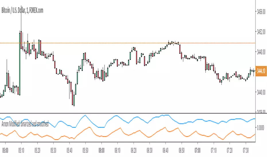 Note that the smoothed Aroon can be viewed as a channel indicator when normalized to price series.