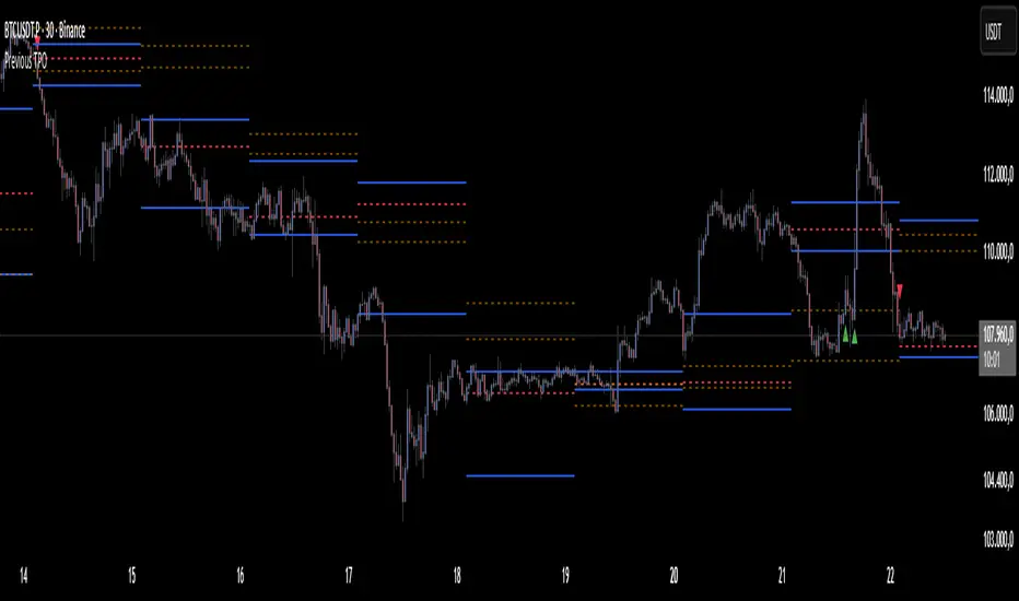This Pine Script indicator, "Previous TPO," is designed to calculate and display five key price levels from the previous trading day's market activity. It uses a 30-minute TPO (Time Price Opportunity) profile, which is a method of organizing price by time to find areas of high and low activity.