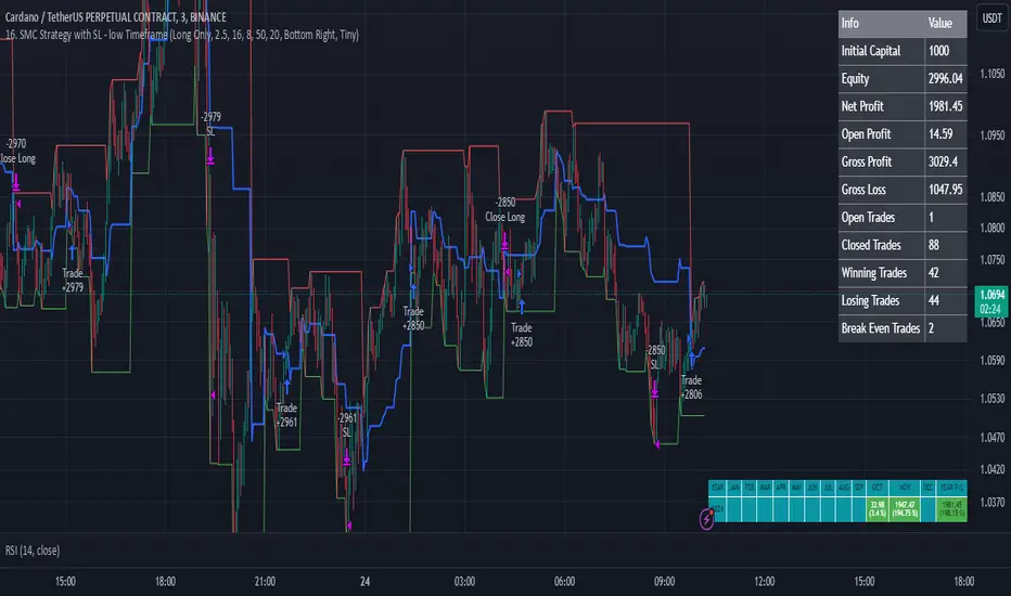 The "SMC Strategy with SL - low Timeframe" is a comprehensive trading strategy that uses key concepts from Smart Money Theory to identify favorable areas in the market for buying or selling. This strategy takes advantage of price imbalances, support and resistance zones, and swing highs/lows to generate high-probability trade signals.