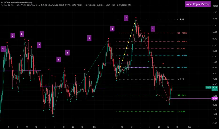 1) Display a configurable ZigZag showing recent price structure with numbered phases (1 = most recent). Users should configure the ZigZag parameters based on whether they are analyzing a Major Degree Pattern (larger swings, less noise) or a Minor Degree Pattern (smaller swings, more detail), following standard Elliott Wave terminology. Configure the ZigZag to match the degree of your analysis: use higher Depth values for Major Degree Patterns, or lower values for Minor Degree Patterns.