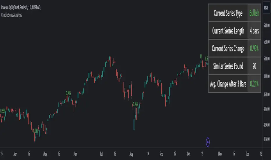 The indicator works by identifying the current series of candles (either bullish or bearish) and calculating its percentage change from the start to the current price. It then searches through historical data to find similar candle series patterns, comparing their characteristics to the current one. The analysis includes the series type (bullish or bearish), length (number of candles), and percentage change.