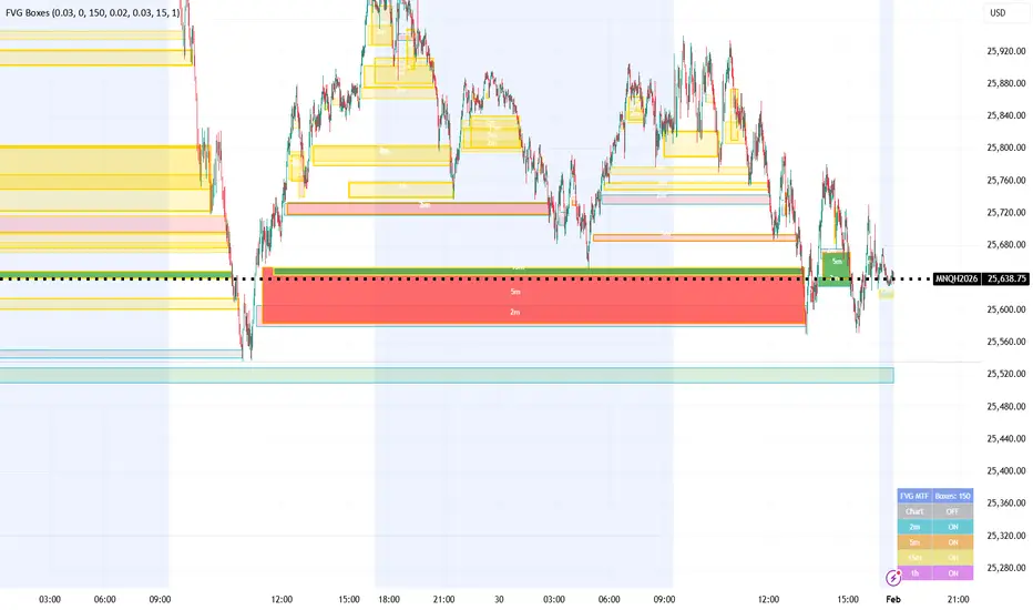 This overlay detects Fair Value Gaps (FVGs) using a 3-bar pattern and draws them as boxes on your chart. You can run detection on several timeframes at once (Chart, 2m, 5m, 15m, 1h) and see all gaps in one place. Each gap is labeled from the timeframe it is detected on.