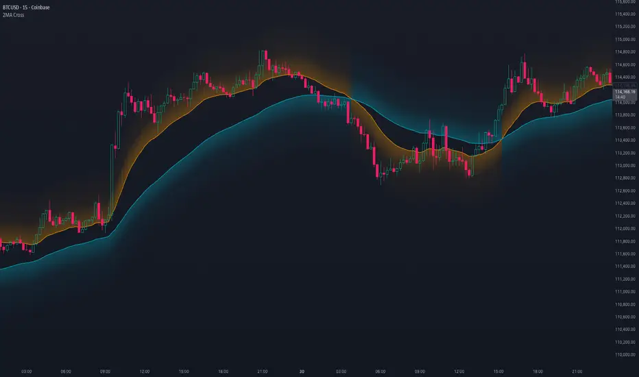 This indicator enhances the classic moving average crossover strategy with a dynamic and visually appealing "glow" effect. It plots two customisable moving averages on the chart and illuminates the area around them when a crossover occurs, providing a clear and intuitive signal for potential trend changes.