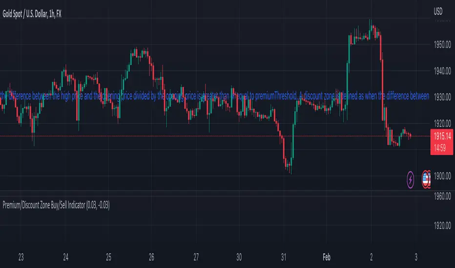 This indicator calculates whether the opening price is in a premium or discount zone, based on the specified premiumThreshold and discountThreshold values. A premium zone is defined as when the difference between the high price and the opening price divided by the opening price is greater than or equal to premiumThreshold. A discount zone is defined as when the difference between the opening price and the low price divided by the opening price is less than or equal to discountThreshold. The premium and discount signals are plotted as green and red triangles, respectively.