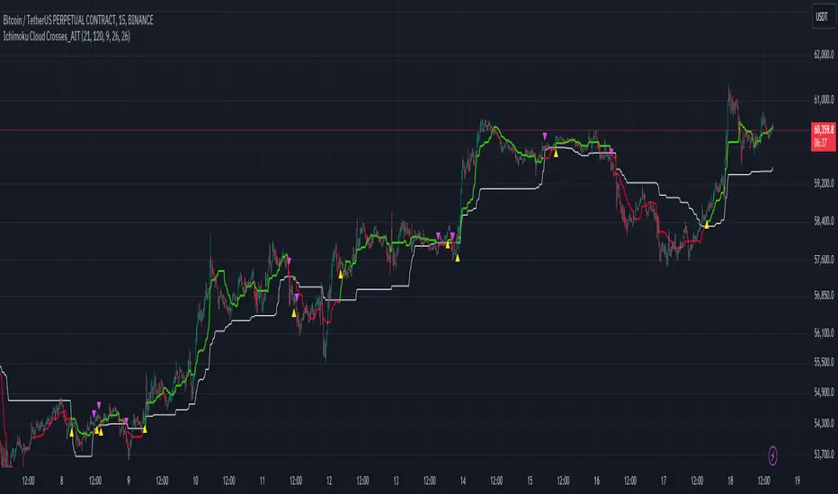 The "Ichimoku Cloud Crosses_AIT" indicator is designed to leverage the Ichimoku Cloud components, focusing on the crossovers between the Tenkan-sen and Kijun-sen lines. This indicator visually displays these crossovers on the price chart to help traders identify potential long and short trading opportunities.