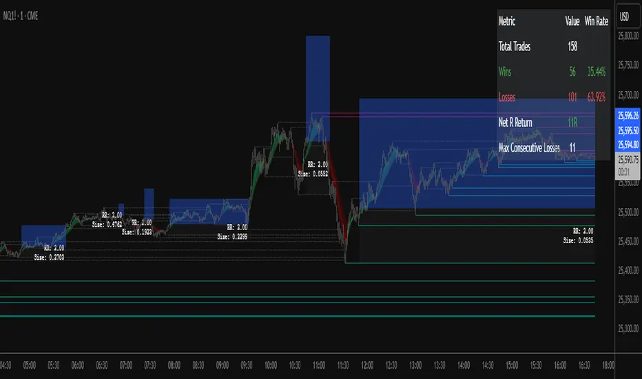 • Trade Execution: On signal, sets entry at close, scans back to mitigation bar for tightest SL (lowest low for buys, highest high for sells). Calculates risk points (entry - SL for buys), then position size via helper function (asset-specific: e.g., XAU *100, futures *pointvalue, forex 100000pointvalue). Sets full TP at entry ± (risk * full_tp_level). Draws risk/reward boxes (e.g., long: dark risk below entry, blue reward above) with RR and size text. Alerts with trade details.