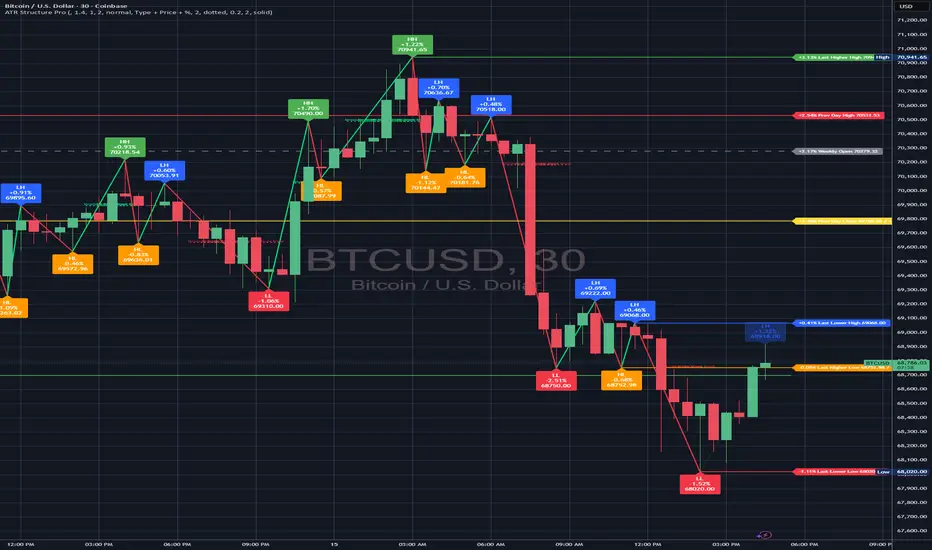 Auto Trend Structure (ATR) v1.01 is a clean, ATR-based market structure tool that automatically maps **HH / HL / LH / LL** pivots without fixed pivot lengths. It draws trend-colored **zigzag structure legs**, highlights **Break of Structure (BOS / CHoCH)** events, and includes a **live “ghost” projection** to show the developing (unconfirmed) next pivot in real time.