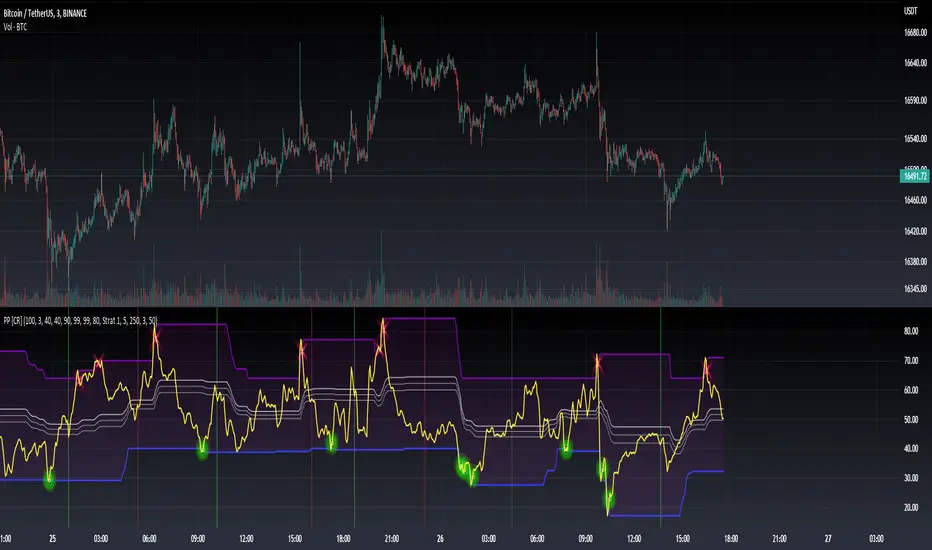 Rather than using fixed overbought/oversold levels, the indicator employs statistical methods to calculate adaptive zones that adjust to recent price behavior. These zones automatically widen during high volatility and tighten during consolidation, ensuring signals remain relevant across all market conditions.