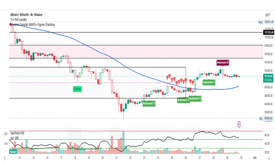 Engulfing: Detects when the body of a candle totally "engulfs" the previous one. Label "Avalement H" (Bullish) or "Avalement B" (Bearish).