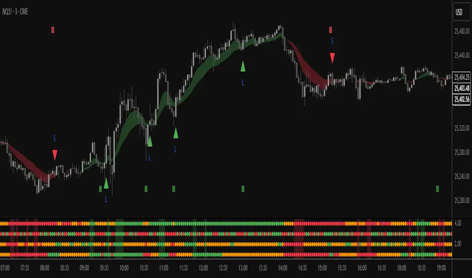 • Trend Trading: Use the ribbon color as your primary filter—enter longs only in green, shorts in red. Confirmed triangles ("L"/"S") signal entries; setups (squares) as early warnings.
