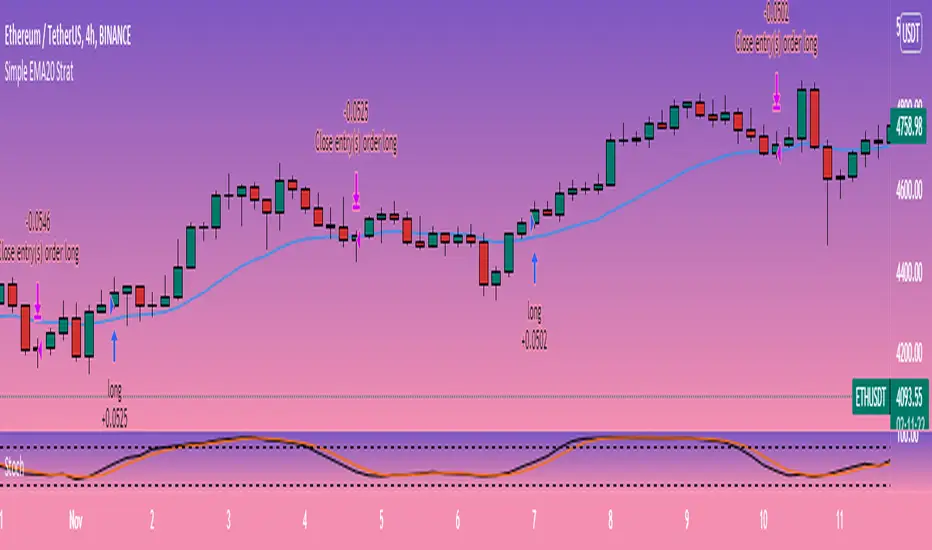The intent of this strategy is to catchthe price as it trends higher than the 20-period EMA and sell immediately after the price closes below it.