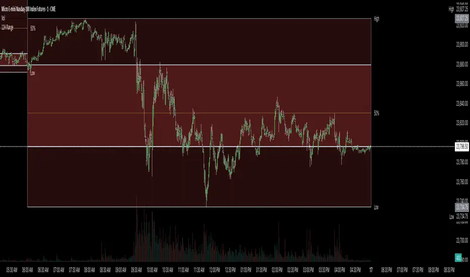 This indicator highlights the 12-hour candle ranges across any chart timeframe. Each 12H candle is split into its body and wicks, with customizable fill and border colors.
