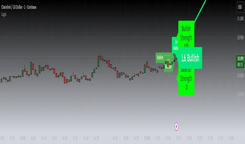 Apply LOGIC directly to your chart on any timeframe. Use it to observe live candle-by-candle behavior as it develops. In practice, L4, L5 and L6 serve as the system’s most selective filters, designed to trigger only when refined streams point in the same direction.