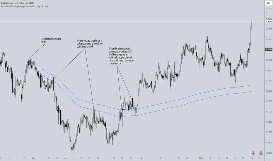The Cumulative Moving Average (Anchored) provides an anchored view of price averages, accumulating values from a user-defined start time. This approach emphasizes long-term trend context while allowing flexible timeframe and price source selection, helping traders identify the cumulative effect of price action over a specified period.