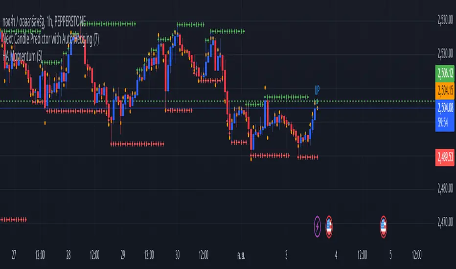 The "Next Candle Predictor with Auto Hedging" is a Pine Script indicator designed for use on TradingView. It combines predictive analysis and basic hedging techniques to assist traders in making informed decisions. Here's a detailed explanation suitable for public sharing on TradingView: