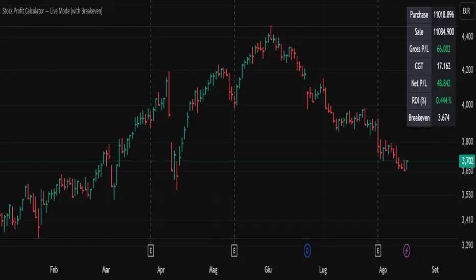 This Pine Script indicator calculates, in real time, the financial impact of a stock trade, including purchase/sale commissions, capital gains tax (CGT), and return on investment (ROI). It displays a compact table with key values and also calculates the breakeven price to see at what level the net P/L returns to zero.