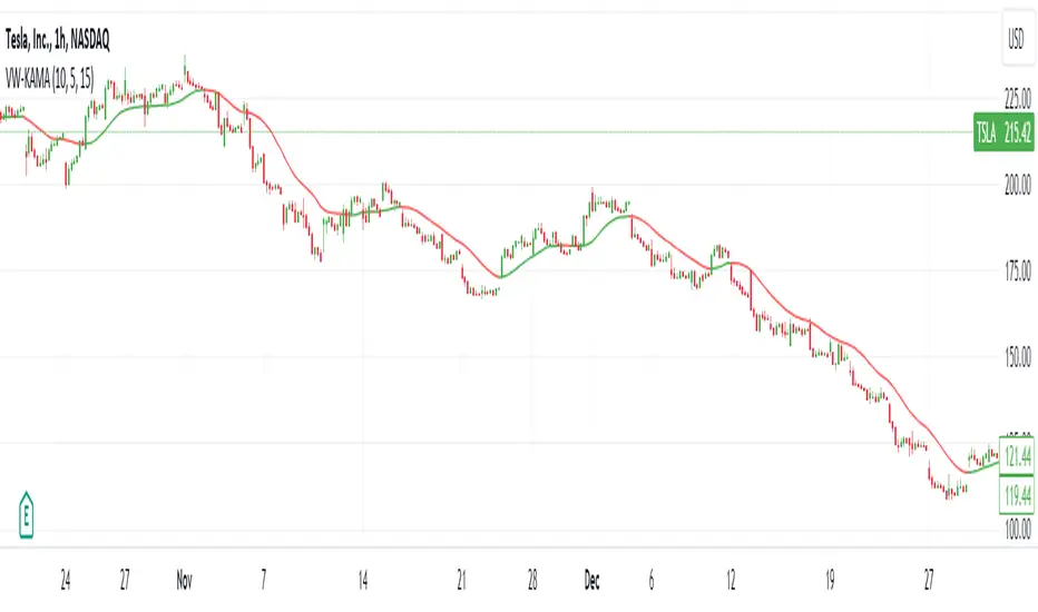 The Volume-Weighted Kaufman's Adaptive Moving Average (VW-KAMA) is a technical indicator that combines the Volume-Weighted Moving Average (VWMA) and the Kaufman's Adaptive Moving Average (KAMA) to create a more responsive and adaptable moving average.