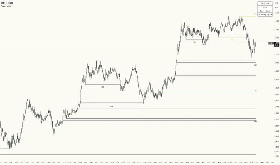 Forever Model is a comprehensive trading framework that visualizes market structure through Fair Value Gaps (FVGs), Smart Money Technique (SMT) divergences, and order block confirmations. The indicator identifies potential price rotations by tracking internal liquidity zones, correlation breaks between assets, and confirmation signals across multiple timeframes.