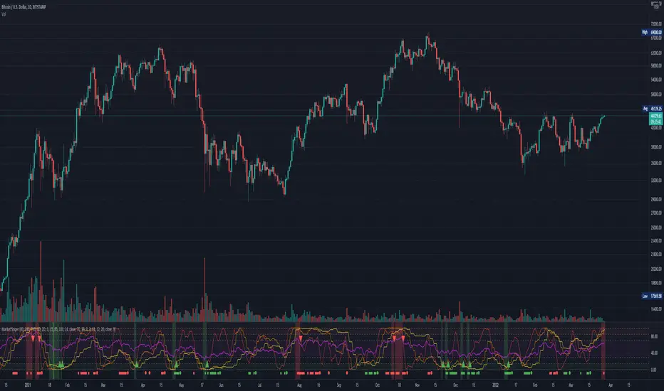 This indicator attempts to catch market tops and bottoms based on the market being extremely extended in its respectful direction. It combines a Triple Stochastic RSI as well as MACD convergences to strengthen the signal. A standard RSI can also be shown if needed.