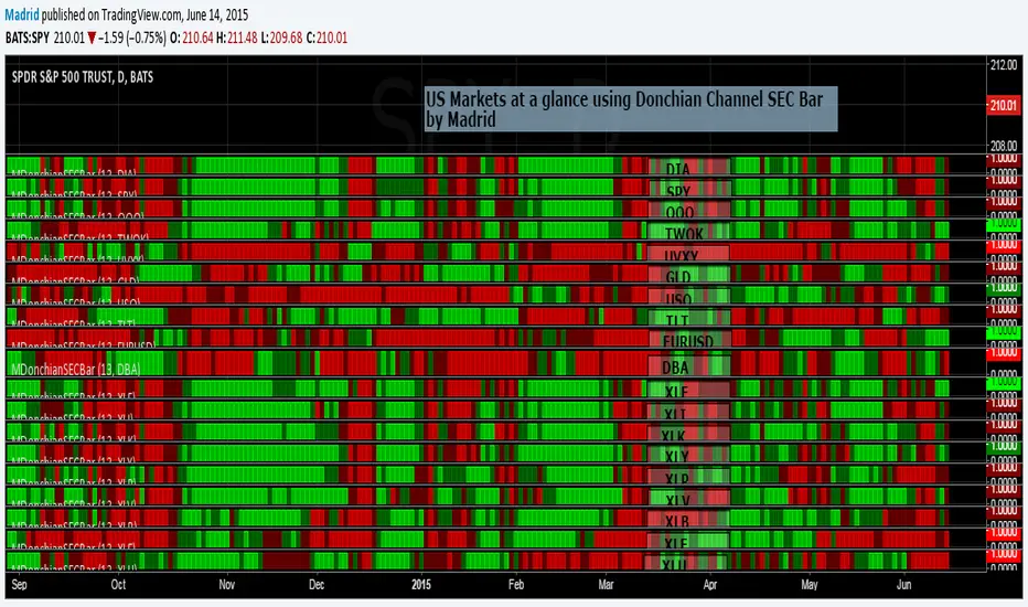 This study is based on the Donchain Channel Bar indicator but this adds security as a parameter. This allows several instances of this indicator to be used in the same page to create a heat map to take look at a glance at several securities, just like the example where this was implemented.